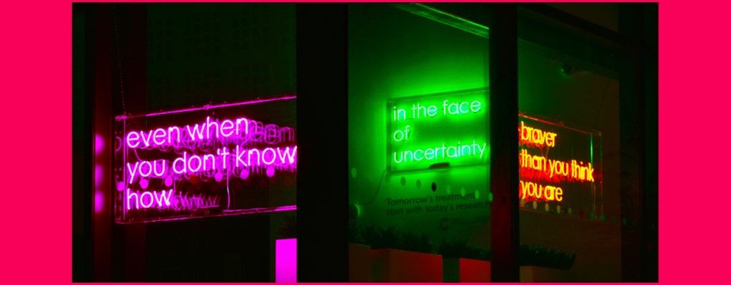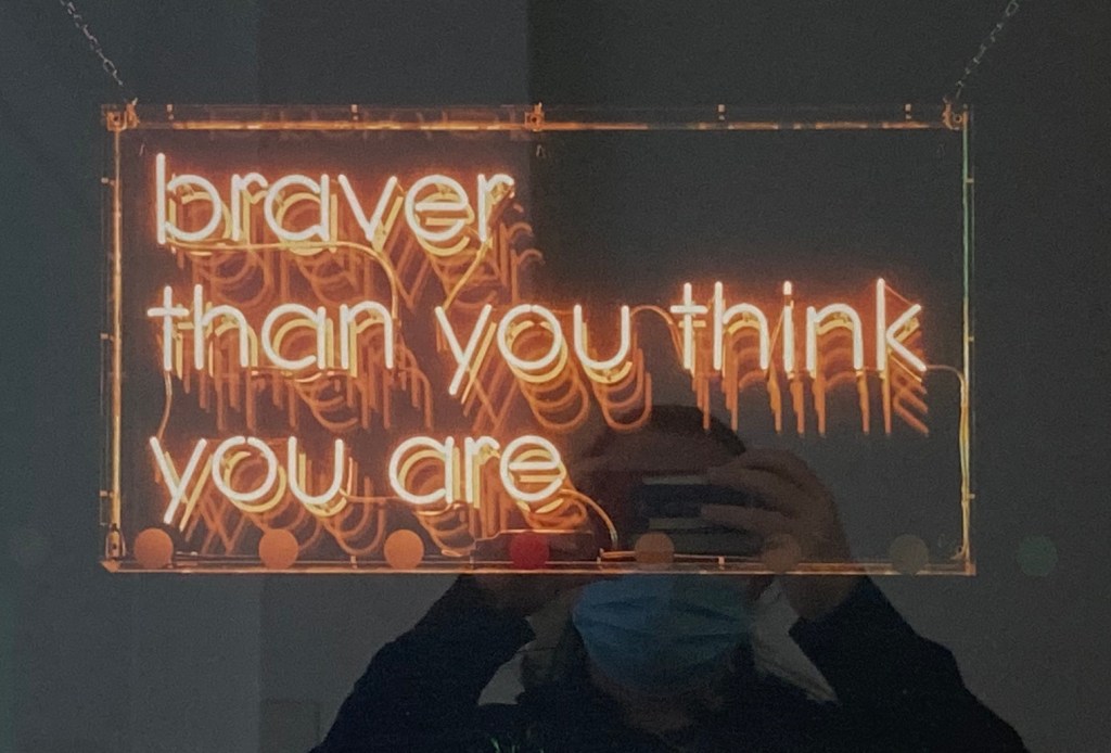 And if that was their aim, what a huge, warm and significant effect it had. The impact on that early morning was huge, and every day since as I walk past (20, and counting…) the prints of these neon lights (the originals are at present shining out in a different building on the campus) stop me in my tracks and remind me to take a deep breath. Even when we don’t know how, in the face of uncertainty, I – and the rest of my family – have indeed found we are braver than we thought we were.